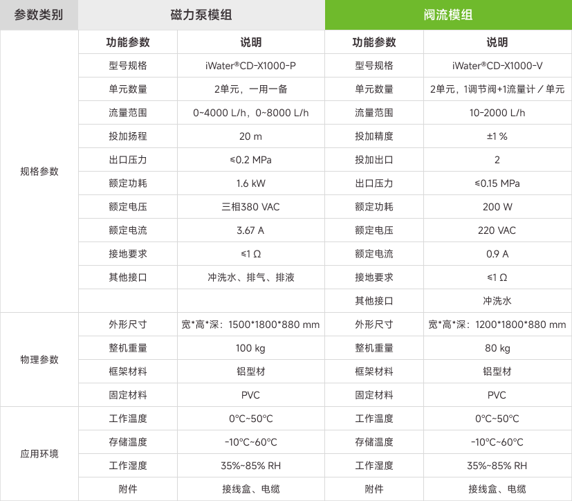 iWater®CD智能安稳投加装备精准型X系列,包括智能控制柜、磁力泵模组、阀流模组。智能控制柜包括控制器,IO模块,通信接口等;磁力泵模组包含两台磁力泵(功率可选)、出口开关阀、止回阀、压力表、固定板、橇装支架;阀流模组包含两台高精密调节阀、两台流量计、阀门冲洗管路、固定板、橇装支架。